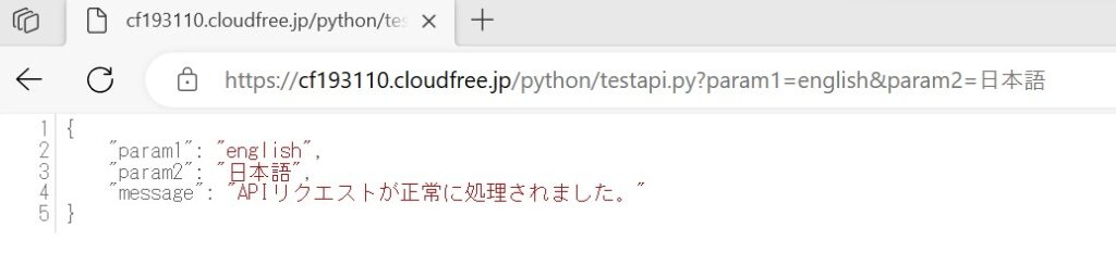https://cf193110.cloudfree.jp/python/testapi.py?param1=english&param2=日本語