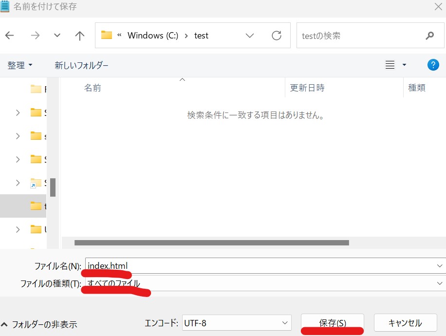 ファイル→名前を付けて保存→ファイルの種類をすべてのファイルにする→ファイル名を任意のファイル名.htmlにして保存(例index.html)