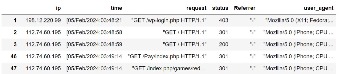 df = pd.read_csv(log_file_path, sep=r'\s(?=(?:[^\"]*\"[^\"]*\")*[^\"]*$)(?![^\\[]*\\])', engine='python', na_values='-', header=None, usecols=[1, 4, 6, 7, 9, 10], names=['ip', 'time', 'request', 'status', 'Referrer', 'user_agent'])