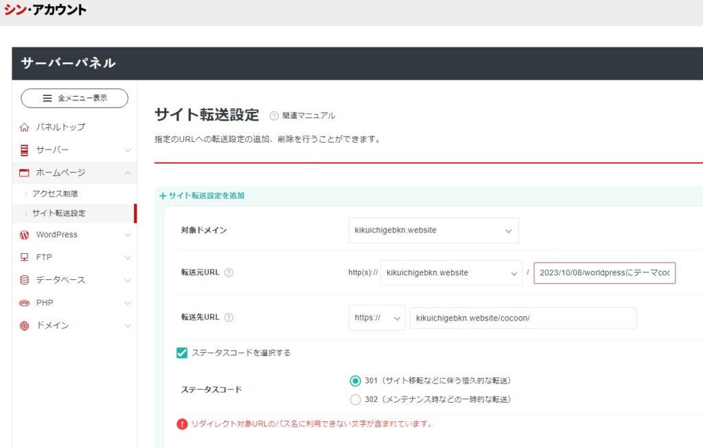 さらにサーバーパネルにサイト転送設定でもダメ。